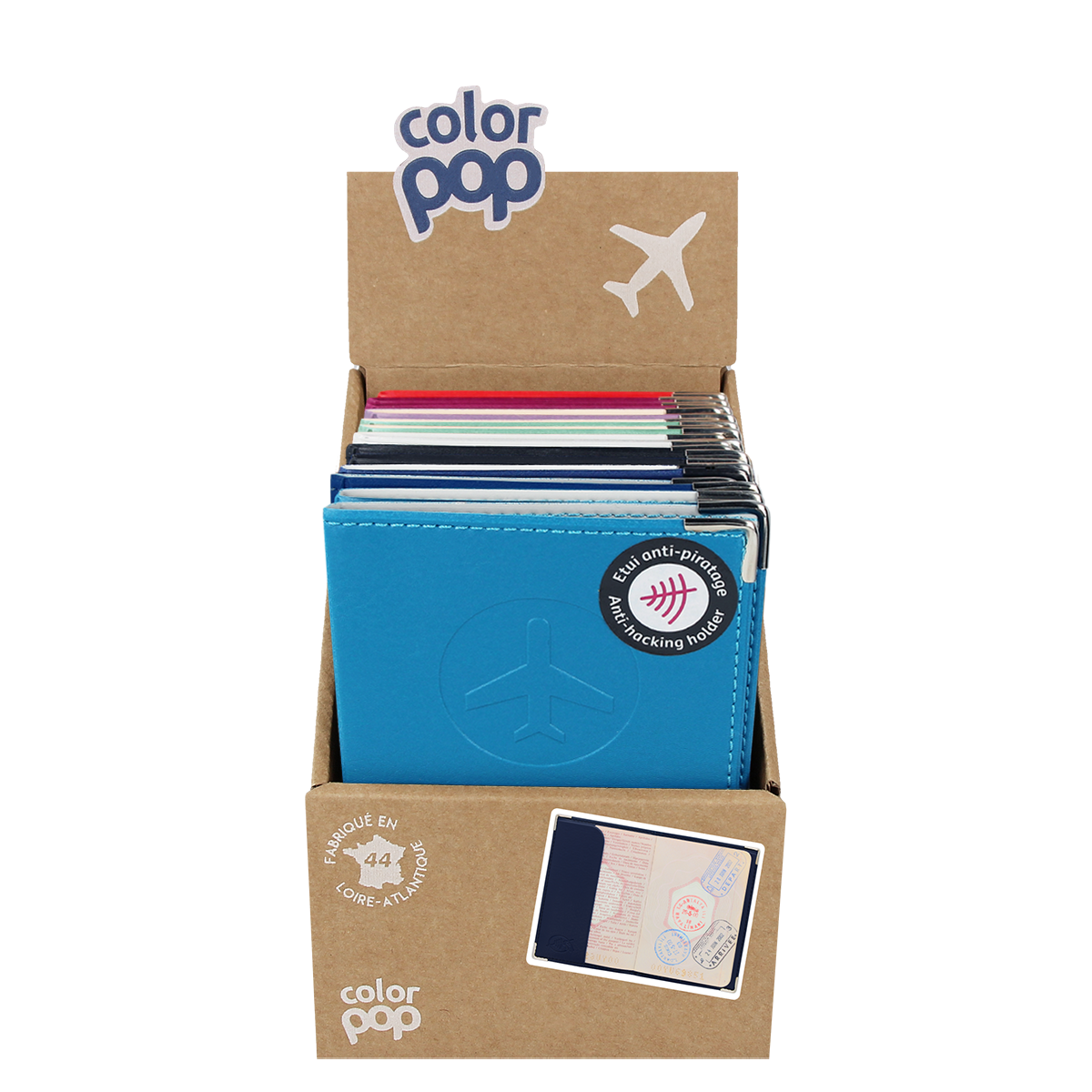Protège passeport QUICK EXIT BLINDE en PVC pour passeport FRANCAIS – Anti-piratage Même si vous ne voyagez pas, le passeport reste une pièce d’identité comme une autre en cas de contrôle. 1 couleur par membre de la famille : idéal pour le passage en douane Les rabats sont ouverts en haut : il est facile d’insérer et de sortir votre passeport. Un film Anti RFID (Radio Fréquence Identification) blinde vos produit pour éviter tout piratage de votre identité. Dimensions produit fermé : H x l x Ep : 13,4 x 9,2 x 0,4 cm Dimensions présentoir ouvert : H x l x P : 23 x 11,5 x 12,5 cm
